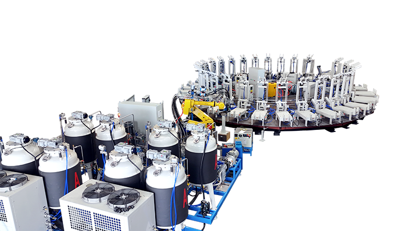 客戶若有自動化生產需求,我們可以為客戶提供相應的解決方案,如全(半)自動圓盤生產線或環形生產線,搭配聚氨酯發泡機、機械手、氣動模架、模溫機形、電控系統等設備形成一條完備的自動化智能生產線。全自動感應實現開合模、噴灑脫模劑、澆注等動作,大大節省人工勞力。PLC集成化控制,輕松操作實現科技自動化。